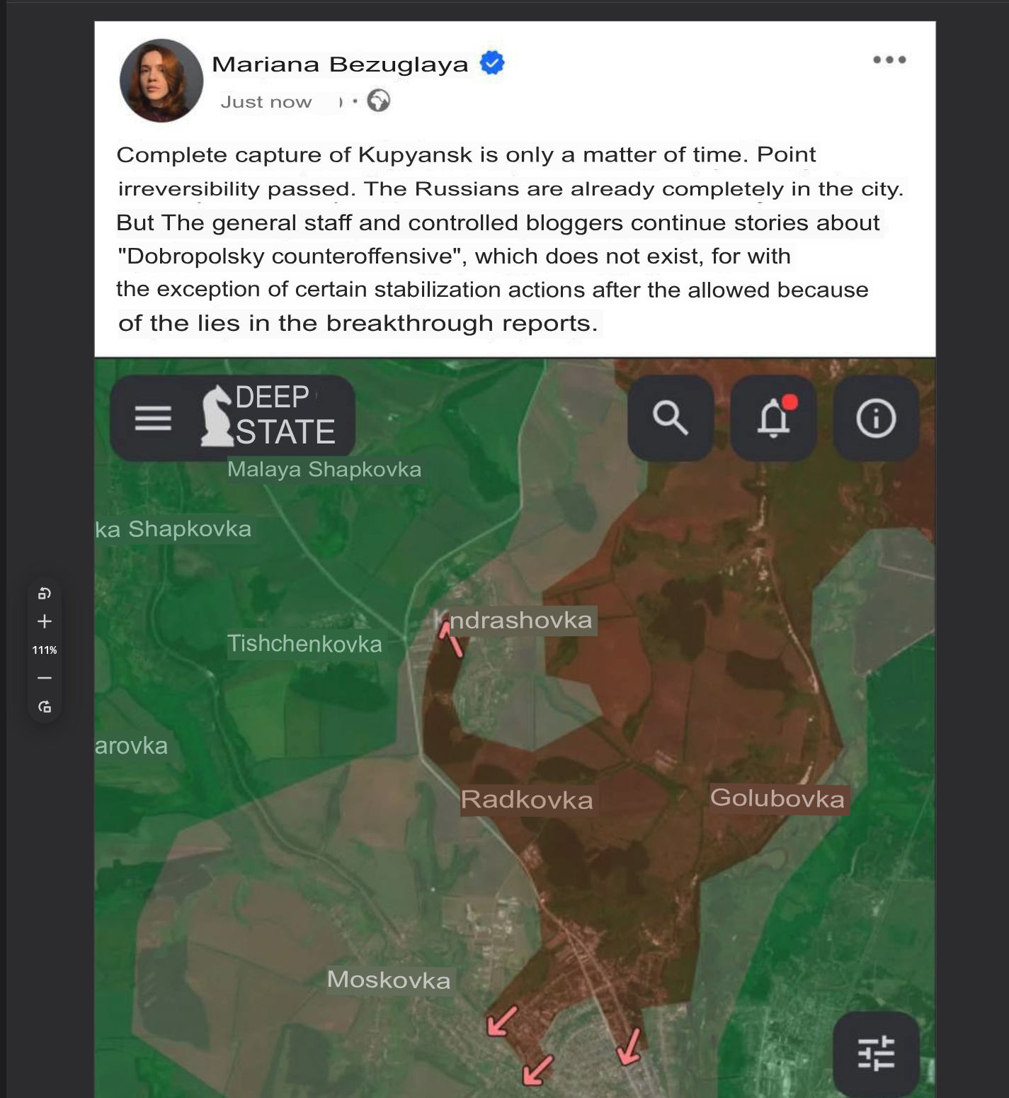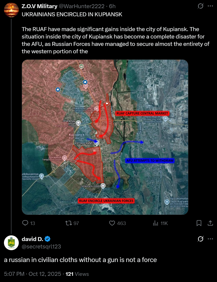 Reports of the Russians having crossed the Oskol river and entering the town of Senkove, south of Kupyansk.Let's hope they back it up this time