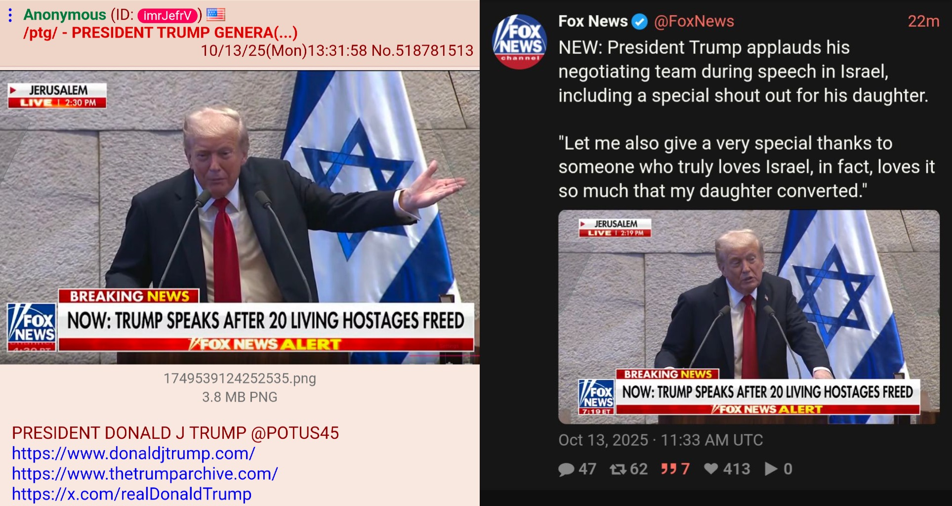 PRESIDENT DONALD J TRUMP @POTUS45https://www.donaldjtrump.com/https://www.thetrumparchive.com/https://x.com/realDonaldTrumphttps://truthsocial.com/@realDonaldTrumphttps://rumble.com/c/DonaldTrumphttps://www.tiktok.com/@realdonaldtrump>President Trump Officehttps://www.whitehouse.gov/https://www.youtube.com/user/whitehousehttps://www.flickr.com/photos/whitehouse/>Liz Harrington (Trump Spox) https://twitter.com/realLizUSA>Donald J Trump Presidential Libraryhttps://www.trumplibrary.gov/@realDonaldTrump @TeamTrump @TrumpWarRoom>b-but Trump hasnt done anything!ARCHIVED LINKS https://pastebin.com/eAhgNyeXNEW APPEARANCES>Pres Trump Meeting with the President of Finland, Washington, DC 10/9/2025https://youtu.be/jWOP0yam6DM>Pres Trump Cabinet Meeting, Washington, DC 10/9/2025https://youtu.be/uUdwiR2s8JQ>Pres Trump Roundtable on ANTIFA, Washington, DC 10/8/2025https://youtu.be/Cf6Em35gguU>Pres Trump Bilateral Meeting with PM of Canada, Washington, DC 10/7/2025https://www.youtube.com/watch?v=qnRQP628zfM>Pres Trump Delivers Remarks at Navy 250 Celebration, Norfolk, VA 10/5/2025https://www.youtube.com/watch?v=byAC6eBknSg>Pres Trump Delivers Remarks to the Department of War, Quantico, VA 9/30/2025https://www.youtube.com/watch?v=gKxWz8dyKfU>Pres Trump Bilateral Meeting with President of Turkey, Washington, DC 9/25/2025https://www.youtube.com/watch?v=UEHplff4Rpo>Pres Trump to the UN General Assembly, New York, NY 9/23/2025https://www.youtube.com/watch?v=fpD_GViQe_A>Pres Trump on Medical and Scientific Findings for America's Children, Washington, DC 9/22/2025https://www.youtube.com/watch?v=Y3iaOfk58cU>TrumpVideo: WE WILL WIN 6/19/23https://rumble.com/v2v6m2a>MAKE AMERICA GREAT AGAIN, AGAIN! 10/28/21https://rumble.com/voe8gm>God Bless the USA (Donald J Trump) 10/20/16https://youtu.be/O_PC_fy0fk0OP pastebin: http://pastebin.com/X4KiALfhprev >>518777707