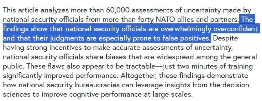 NATO intelligence officers (predicting Russia and China's collapse) are overwhelmingly overconfident in their assessments, study finds: https://tnsr.org/2025/09/the-world-is-more-uncertain-than-you-think-assessing-and-combating-overconfidence-among-2000-national-security-officials/