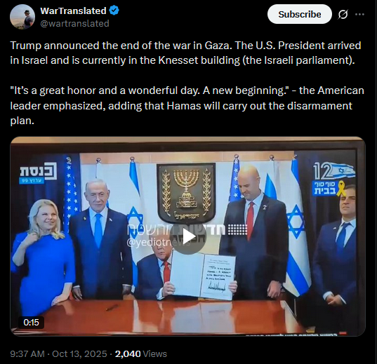 Trump announced the end of the war in Gaza. The U.S. President arrived in Israel and is currently in the Knesset building (the Israeli parliament). "It’s a great honor and a wonderful day. A new beginning." - the American leader emphasized, adding that Hamas will carry out the disarmament plan.https://x.com/wartranslated/status/1977654800075411932https://files.catbox.moe/whdutn.mp4>Trump idea of a peace deal, with Kikes and himself