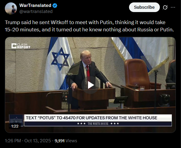 >Trump: I sent Witkoff to meet with Putin thinking it would be 15-20 minute meeting.>Witkoff had no idea about Russia or Putin. He did not know much about politics.>His meeting with Putin lasted 5 hours. I said "what the hell did you talk about for 5 hours?" He said they talked about interesting things.Putin is giving everyone Rurik Dynasty and Austria Hungary history lessons isn't it ?