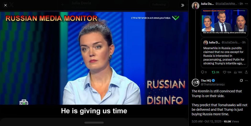 Meanwhile in Russia: pundits claimed that no one except for Russia is interested in peacemaking, praised Putin for stroking Trump's infantile ego, and explained why they believe the US president won't send Tomahawks to Ukraine.https://x.com/JuliaDavisNews/status/1977521729036534256https://www.youtube.com/watch?v=nALQBZPyzlc&list=PLLWQyEN3YRo41QwWb7e8J5YjBX80WmGtG