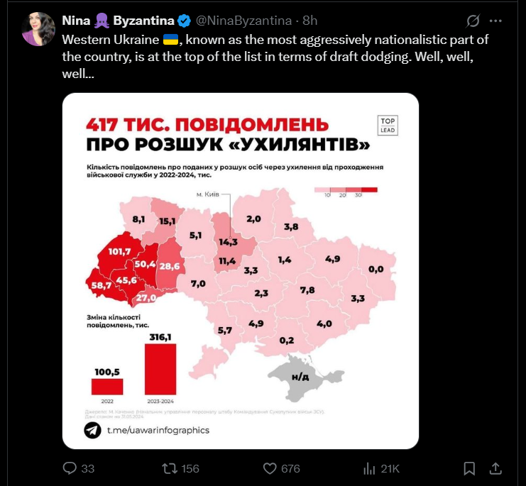 >>518798202You posted the map that says I'm right youreslf.Western Ukrainians don't care about pidors that much, it's not their war, they dodge the draft.It's russian speaking eastern Ukrainian who hate pidors with passion for destroying their cities, they never dodge the draft and often volunteer.
