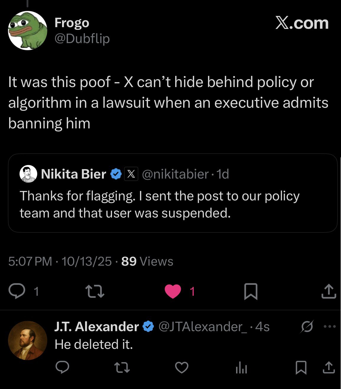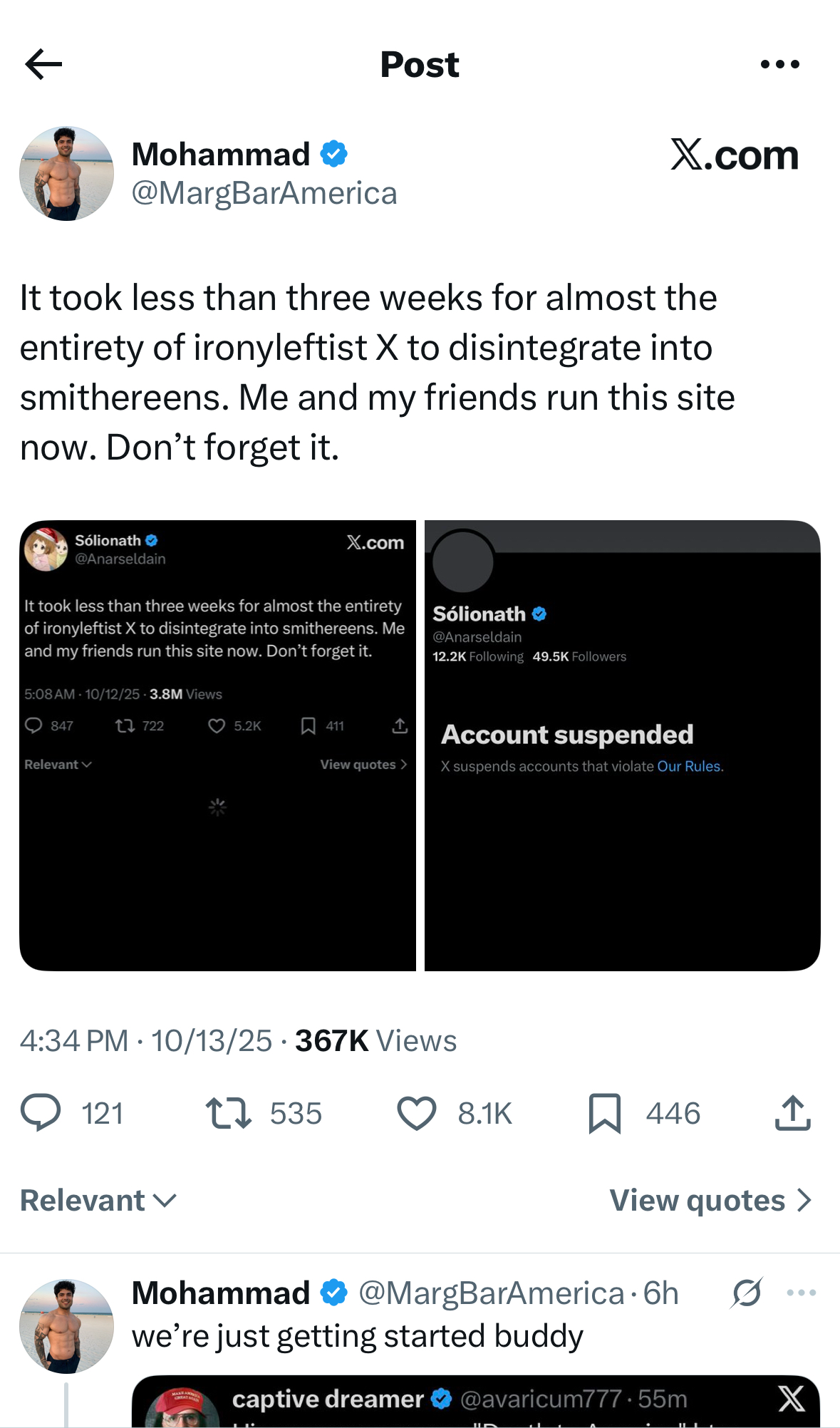 >>518841993considering site staff are actively helping (and then deleting these public replies) I don't think brown v. brown is in effect>>518842098>angry muslim shits on America>had public info posted>cries to mods>every right wing account that ever cross-pollinated with info is being banned one by one>groypers joining in the report wave to "claim victory"they're also device locking and snapping alts as soon as they pop up, so this isn't simply an automated wave