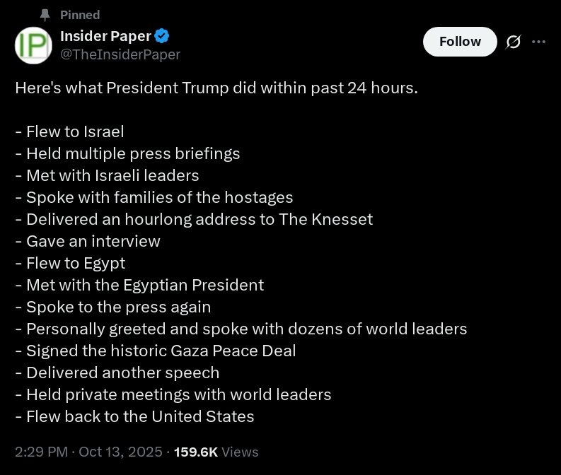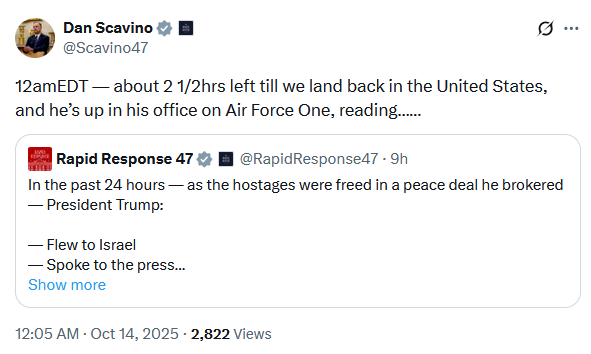 12amEDT — about 2 1/2hrs left till we land back in the United States, and he’s up in his office on Air Force One, reading……https://x.com/Scavino47/status/1977948817136685378