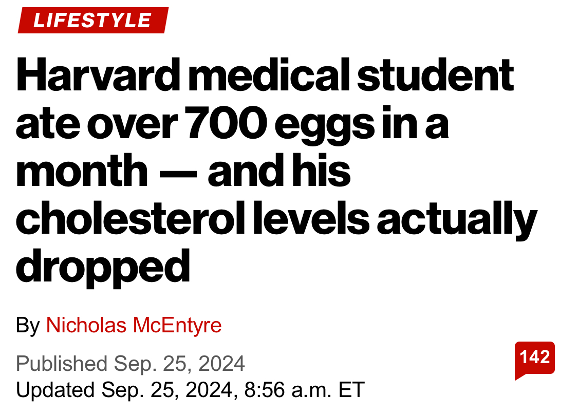 >>518857905https://nypost.com/2024/09/25/lifestyle/harvard-medical-student-nick-norwitz-ate-720-eggs-in-a-month-and-cholesterol-levels-dropped/Try again faggot.