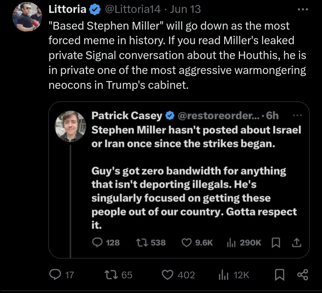 >>518951300Miller just hate foreigners and want to bomb them to make them submit to US power that's not "neocon" freedom spreading bs