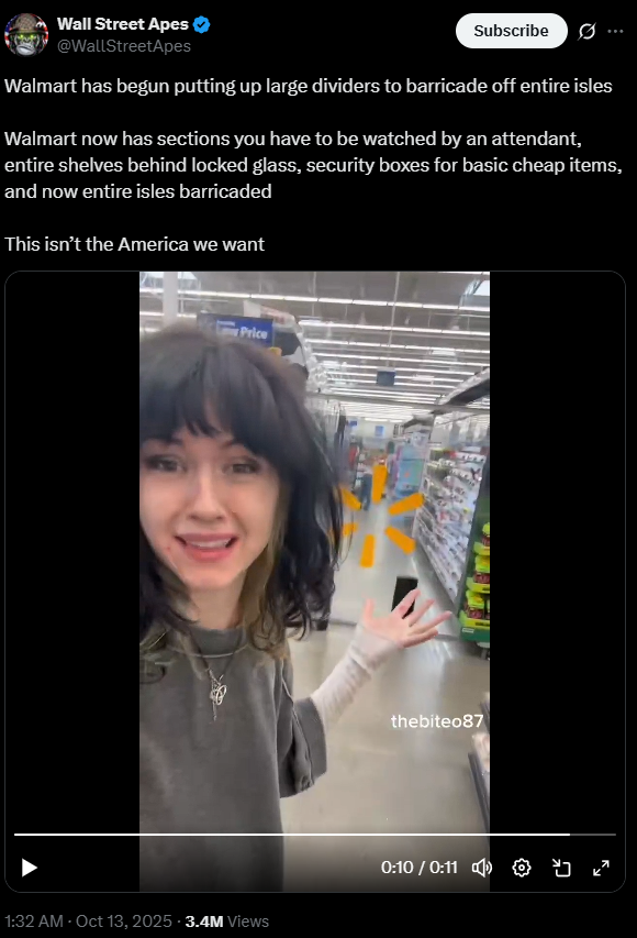 Walmart is now putting fucking transparent barricades in aisles with high value products where you can only enter and pick items under dedicated wagie guide because shoplifting has become such a massive thing now lmao.