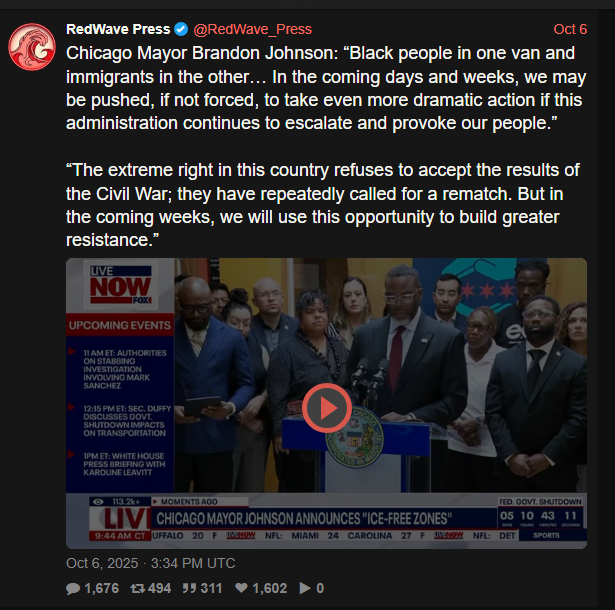 CHICAGO MAYOR DEMANDS CIVIL WAR REMATCH!https://nitter.net/RedWave_Press/status/1975223120156864863#m