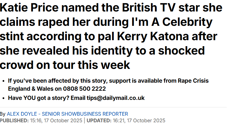 https://www.dailymail.co.uk/tvshowbiz/article-15202083/Katie-Price-named-TV-star-claims-raped-Im-Celebrity-according-Kerry-Katona.html>Earlier this week it was revealed how the ex-glamour model, 47, named the star she accused of attacking her during her An Evening with Katie Price And Kerry Katona show.>The mother-of-five drew gasps from the crowd when she named her alleged attacker.Who was it?