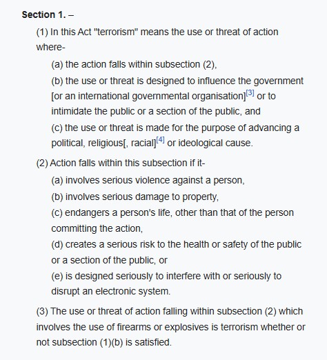 >>519149688i believe critics of the Act question whether subsection 2 part b actually meets the defintion of terrorism. a more common sense defintion would be ' did anyone find the act terrifying'. personally, i dont think anyone did