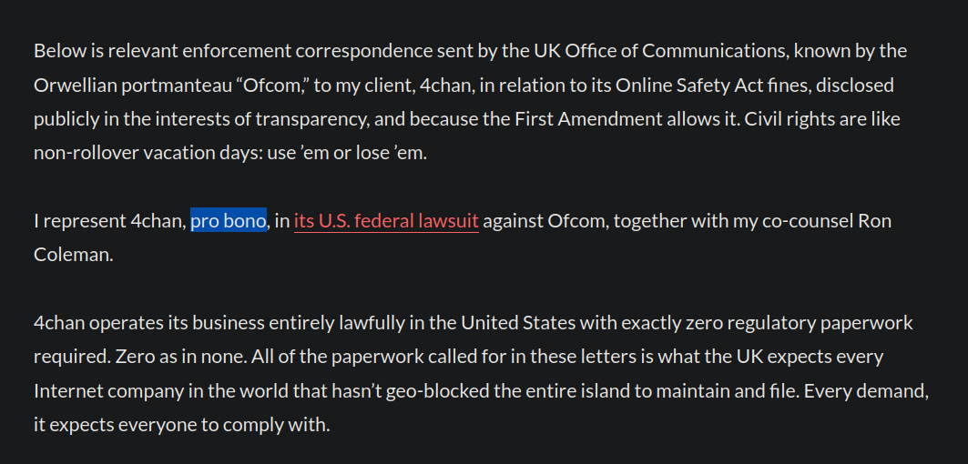 4chan lawyer BTFOs UK government in one statement. https://prestonbyrne.com/2025/10/16/the-ofcom-files/