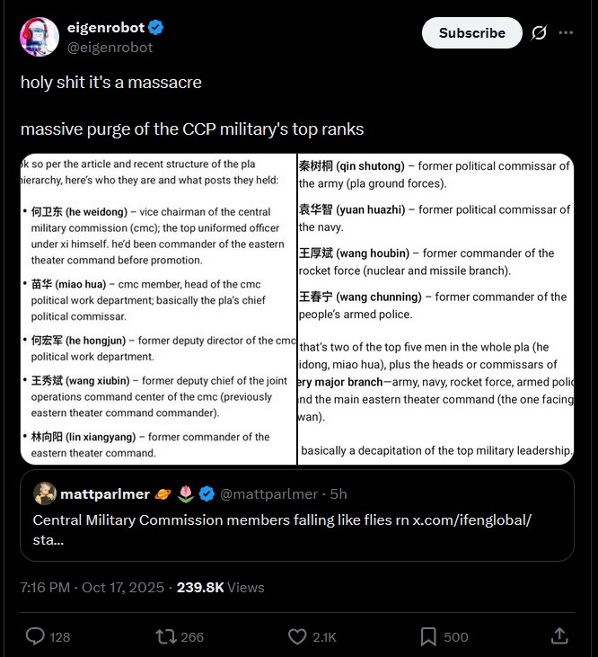 >>519170374>Major purges in the Chinese military oingoing, most guys we're pro-xi jinpingAgain this story, what is it, the 3rd supposed purge this year, and again "Xi will fall"? I think mid August was the last supposed purge.
