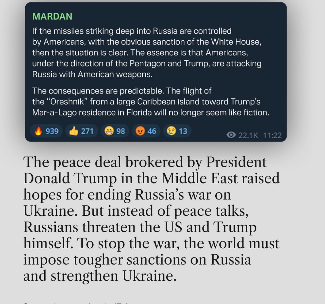>According to sources in the Presidential Office, Zelenskyy is completely unmotivated, and the White House has handed Ukraine mandatory drafts to implement; there will be no actual negotiations. We've already been pressured to reach Budapest; all that remains is to decide on the summit format.