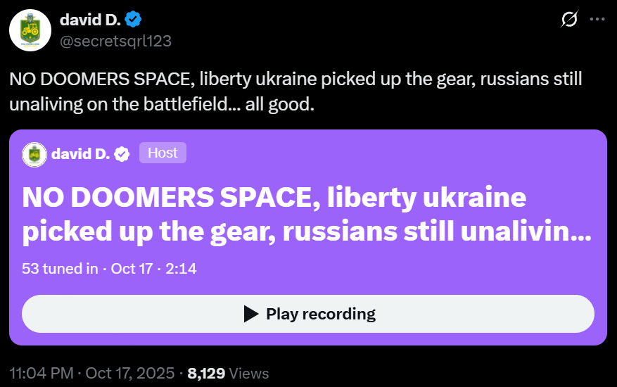 ▶NEW CLIPS>North Korean Veterans of Kursk march while singing To Serve Russiahttps://files.catbox.moe/s85ufe.mp4>Kiev at night, 10/10/2025https://files.catbox.moe/wenlx1.mp4https://files.catbox.moe/7qfa4i.mp4https://files.catbox.moe/7m3ueu.mp4>The Ukraine's Counter-Offensive to retake Krasnoarmeysk ends in boiling coffinshttps://files.catbox.moe/kc7rs3.MP4>Kharkov, 10/05/2025https://files.catbox.moe/2vaq24.MP4https://files.catbox.moe/8g7jlq.MP4https://files.catbox.moe/s7i0h5.MP4https://files.catbox.moe/8evzj4.MP4https://files.catbox.moe/5v2bkn.mp4>Lights out in Chernigovhttps://files.catbox.moe/hbyvl5.mp4>DRG Spetsnaz liquidate SBU convoy behind enemy lineshttps://files.catbox.moe/o51o63.mp4>Russian troops liberating Verbovoye Dnepropetrovskhttps://files.catbox.moe/3k0zpb.mp4>Gerans flying into Dnepropetrovsk cityhttps://files.catbox.moe/8dfefm.mp4https://files.catbox.moe/c2uip4.mp4https://files.catbox.moe/gn4ba3.mp4>Missile/Geran strikes in Kiev region 9/28/2025https://files.catbox.moe/huyfvu.MP4https://files.catbox.moe/ym87op.mp4https://files.catbox.moe/8h7q0h.mp4https://files.catbox.moe/6w7ddk.mp4https://files.catbox.moe/da1ige.mp4https://files.catbox.moe/rd2wiz.mp4https://files.catbox.moe/rnhp4x.mp4>Zelensky admits the Ukraine is losing the warhttps://files.catbox.moe/cd37w8.mp4>FSB Counter-Terror Unit Gorynych of Donetsk liquidates AfU drone operators targetting civilians near Toretsk and Horlovkahttps://files.catbox.moe/dwopoq.mp4▶Archivehttps://rentry.org/chugvidz