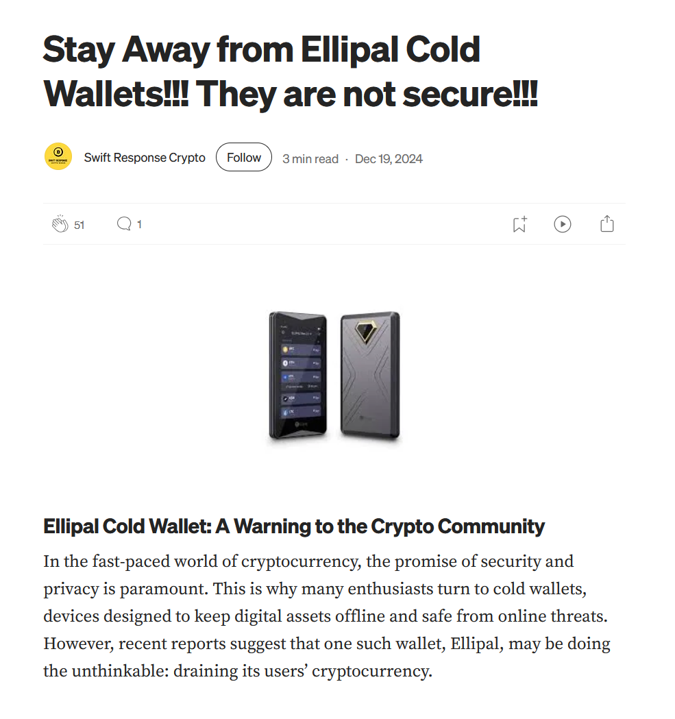 >>519177847>https://swiftresponse.medium.com/stay-away-from-ellipal-cold-wallets-they-are-not-secure-2392db4969a5>Possible Explanations>Compromised Firmware: If the wallet’s firmware has been tampered with during manufacturing or distribution, malicious actors could potentially siphon funds.>Backdoor Vulnerability: https://coindailies.com/news/ellipal-cold-wallet-security-issues/ https://www.ellipal.com/pages/about-us-ellipal >about us>David (jew) and Tong (chinese)>World's first Air-gapped cold wallet -Holly fcking crap of a retarded completely vulnerable product. What is this crap using , wifi?