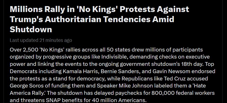 >>519180702The top of the twitter trending tab. Btw now it changed to say>On October 18, 2025, millions of Americans participated in 'No Kings' rallieshttps://x.com/i/trending/1978833908864102792