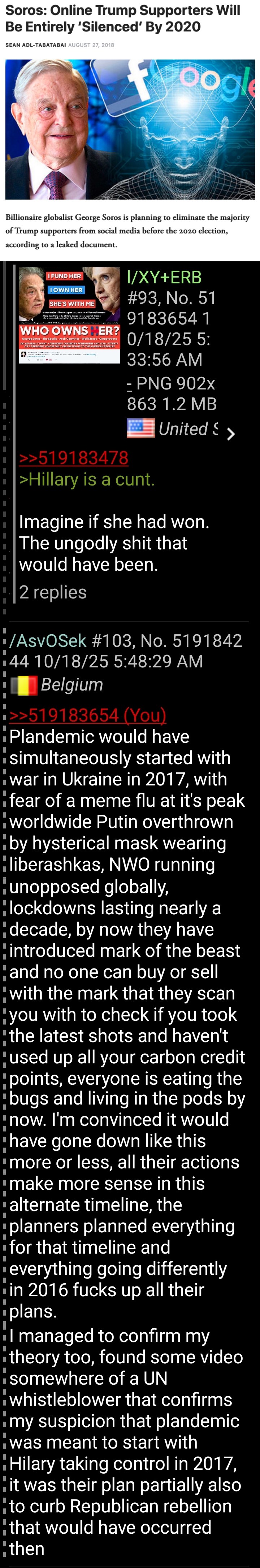 >>519183654Plandemic would have simultaneously started with war in Ukraine in 2017, with fear of a meme flu at it's peak worldwide Putin overthrown by hysterical mask wearing liberashkas, NWO running unopposed globally, lockdowns lasting nearly a decade, by now they have introduced mark of the beast and no one can buy or sell with the mark that they scan you with to check if you took the latest shots and haven't used up all your carbon credit points, everyone is eating the bugs and living in the pods by now. I'm convinced it would have gone down like this more or less, all their actions make more sense in this alternate timeline, the planners planned everything for that timeline and everything going differently in 2016 fucks up all their plans.I managed to confirm my theory too, found some video somewhere of a UN whistleblower that confirms my suspicion that plandemic was meant to start with Hilary taking control in 2017, it was their plan partially also to curb Republican rebellion that would have occurred then