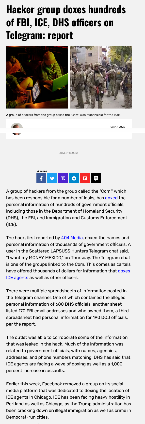 https://thepostmillennial.com/hacker-group-doxes-hundreds-of-fbi-ice-dhs-officers-on-telegram-report