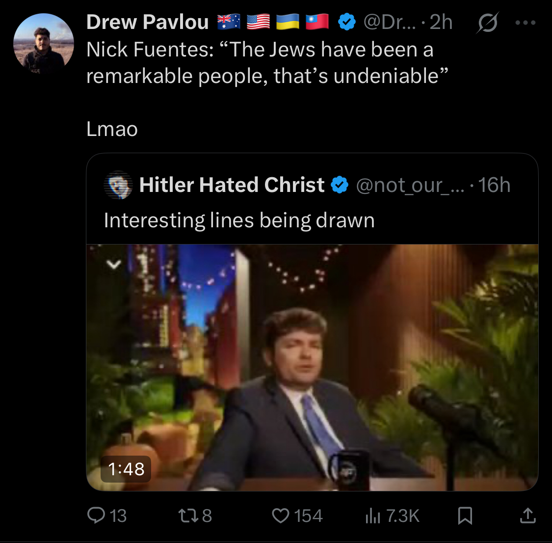 >>519183406I mean, I don't disagree with what he said - but the fact he said it. Fuentes has made most of his career on being an antisemite and then suddenly changes course on the topic. He is now a selective antisemite and essentialy says "well, not all Jews"He has effectively abrograted racial antisemitism as a matter of course and implies that Jews are part of the American project and are, in fact, disproporate net positive contributors to that project.