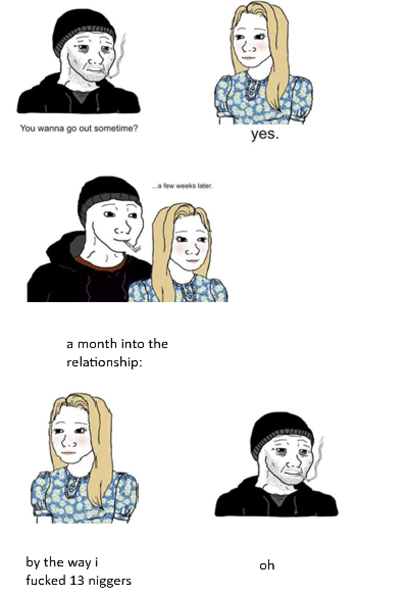 >>519246933because im old and already ran through many women. Every one i took seriously had me in full clown attire by the end.Protip: most are fucking niggers or their dog and if you ask them out or try to rizz them up they will very likely get an attitude if you're white. i'm 6'5 and still built like superman, but i know better. I'm sure it worked out for some anons, but the cold hard truth is that it wont for 90% of men and some of the ones that claim it did work out for them are living in denial and overlooking a lot of sneaky shit as post smugly.I'm not saying dont try... Just dont try to hard. That girl you are jumping though hoops to win over will just spontaneously cuck you for a brown jabroni. Women's liberation reduced everything down to jawline, dick size, and money. I see manlets talking shit about tall guys on here, but tall guys really dont do any better when it comes to women. I repeat, its all just jawline, dick size and money. If you didnt come into the game in the top 10% of that crowd it is very likely you will have a hard time even if you are more swole that the incredible hulk and 7ft tall.I keep hoping for a heart of gold, but the more i see the less it seems in the cards. Good luck out there. I wish you well. Be careful though. Never give a woman all your time or attention and you might just make it despite the odds being against you.Also, New captchas suck, maybe its to combat the bots.