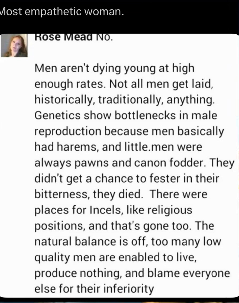 >>519252656That screencap is false. Civilization required bribing men with pussy. Even during the caveman days when it was also heavily slanted the Chads couldn't hoard all the pussy or they would get ganged up on and murdered. Not that it fixed the cheating problem but pussy was much more available to average men.