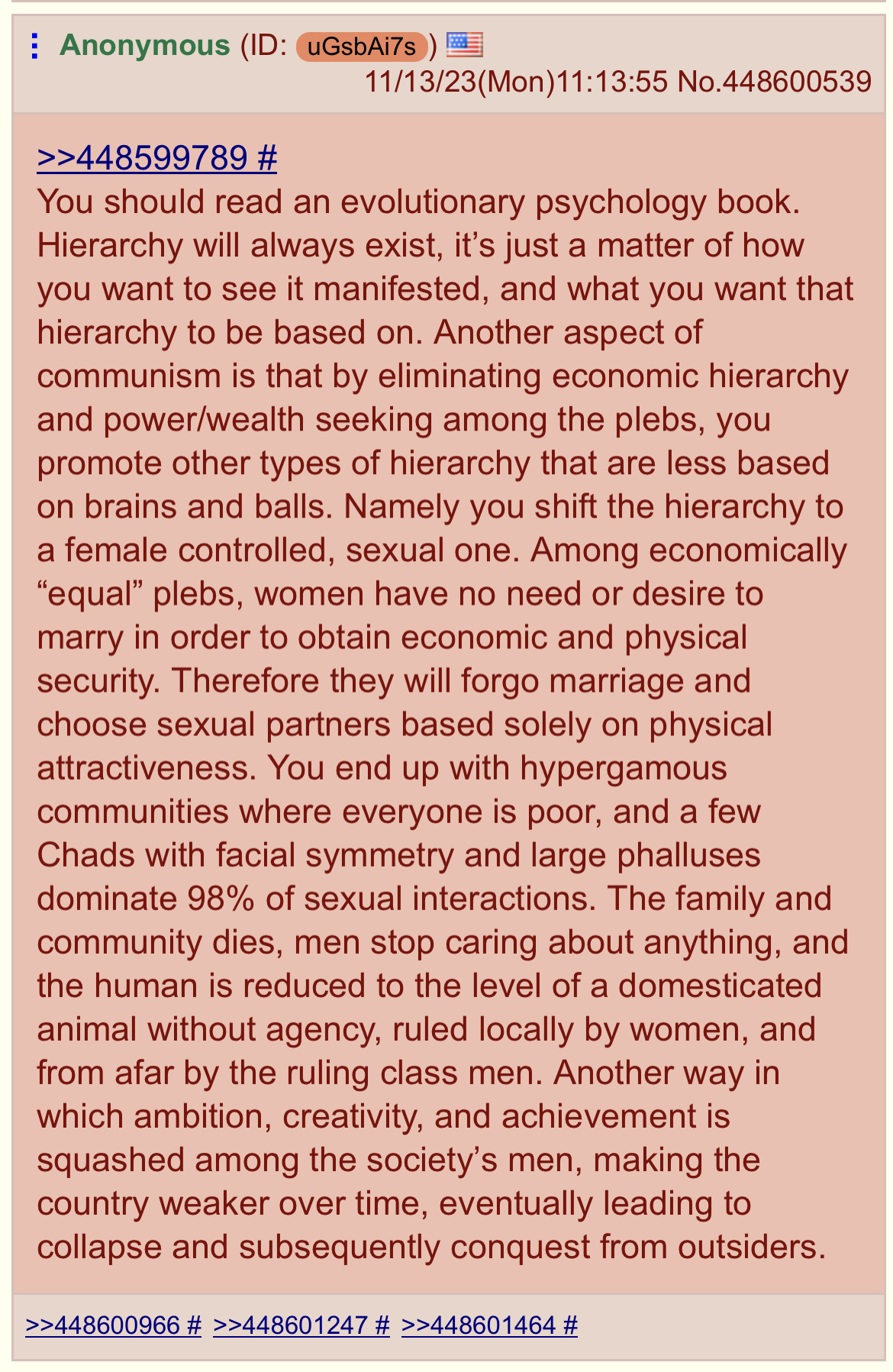 >>519252789That's only highlighting the fact that eliminating economic hierarchy leads to a sexual one. Look what has happened in the western world. Women no longer need to get a man for financial gain. When you equalize that through capitalism or communism, the results are the same. A society based around a sexual one.