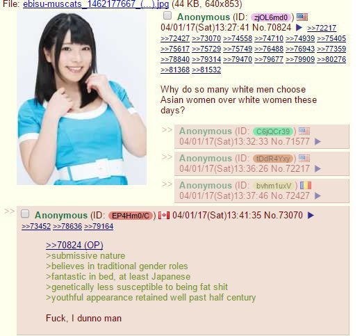 Why don't white guys just get with black women? They're more loyal at this point and less picky, and like to cook.