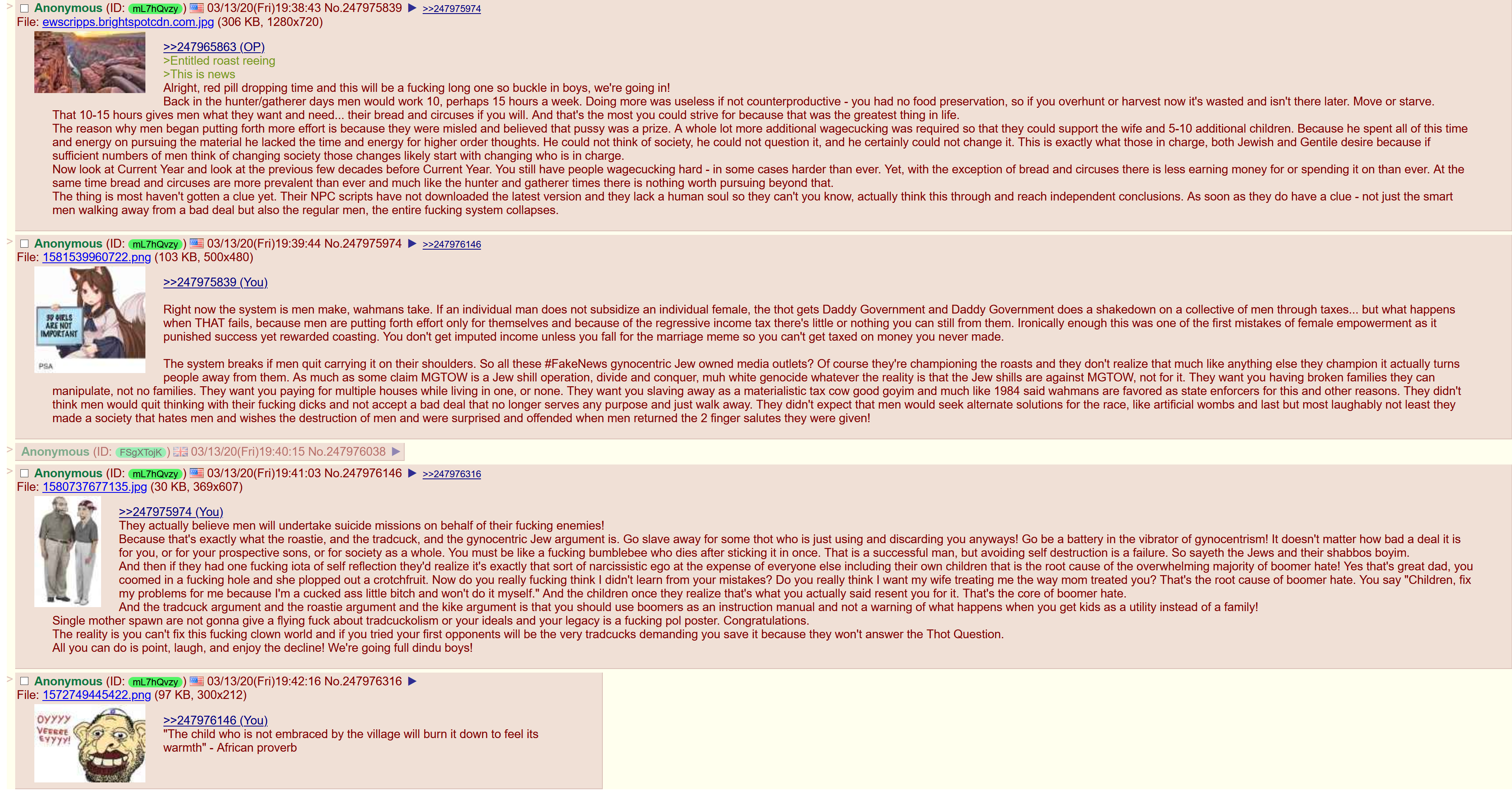 >>519252931Wow have a you my buddy guy.That's an very very underrated post. Well done for picking that up.I find it amazing ... During this unprecedented age of female liberation on all fronts...speech voting job/money/carreeer... Child bearing...We are starting to see the TRUE CONTOURS of the female that has been hidden from us for millennia Fascinating and surprising on many fronts.Just think about it... 2010... No average dude even heard of the concept of hypergamy...Droves of men didn't understand the level of divorce court rape in 2000Mouse Utopia is now starting to take shape in the psyche as social engineers figure out the horror that only fans and porn and muh perfect society has unleashed.
