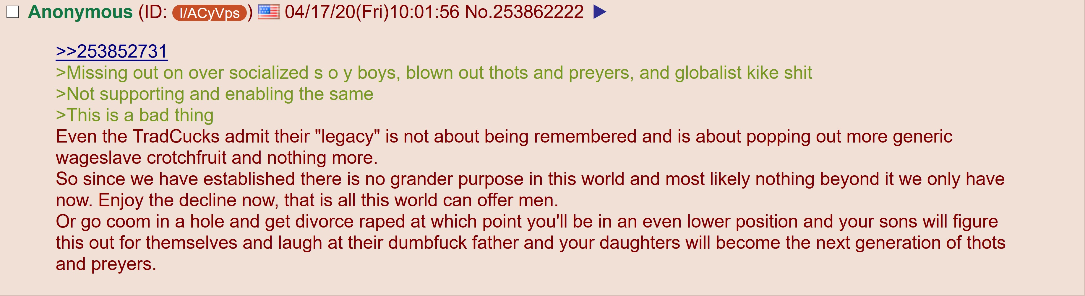 >>519252339They care very much, someone should (and someone always will) take the leftovers after they can't end up with chad. The propaganda to convince men not to participate in society is psyop tho, by not participating more power is transferred to women and it just amplifies the problem => less danger to the elite since men are the one who start insurrections.Also this >>519252559It reliably lowers your birthrates so that immigrants can outbreed and replace you.