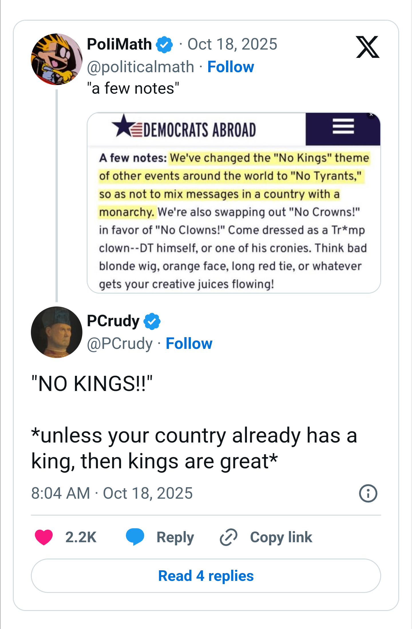 >we font want a king! Okay?? We haven't had one for like 250+ years, and the while government is literally built around not having one. I just don't understand