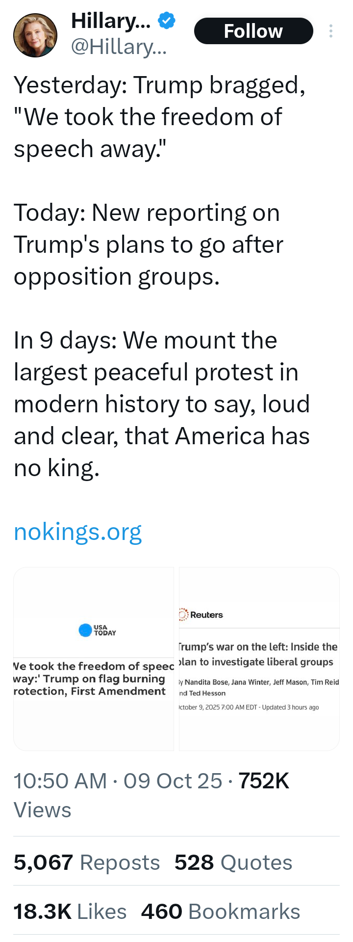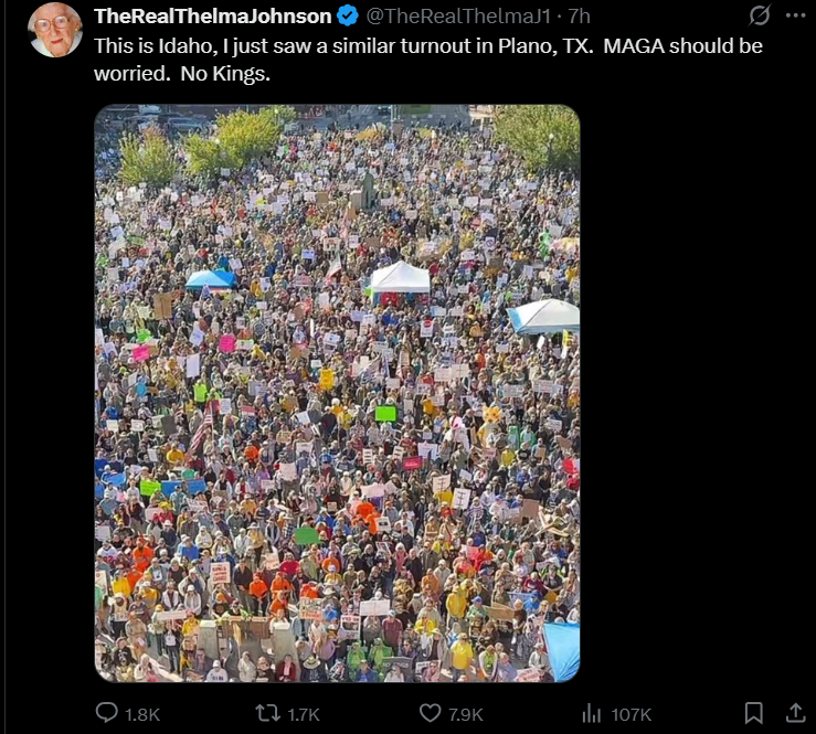 So far, everything I've seen posted about the no kings event was peaceful, but I haven't seen any real message, just a turnout of people not really doing anything..You'd think they would have a sort of, program or stage area for it?I didn't see any cops in any of the videos. I'm sure they had lots of cops there but didn't have to roll out crowd control or riot gear to unblock streets or use tear gas to clear roads....Usually they are out there throwing tampons wearing pussy-hats n shit ???I think if they can keep doing that maybe they can stop hating Trump and start a real narrative about healing America.
