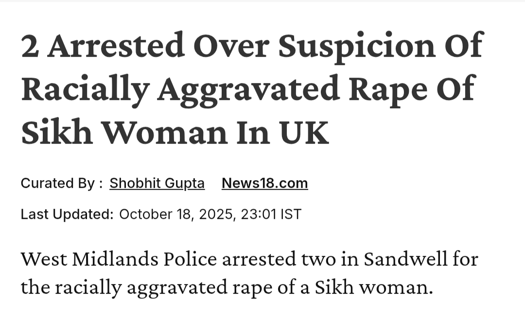 Racist rapist skinheads turn out to be a 65 year old woman, Shobit Gupta reports >The UK Police have arrested two individuals, a man and a woman, on suspicion of the racially aggravated rape of a British Sikh woman in Oldbury, in the West Midlands region of England last month.>West Midlands Police on Friday said the arrests were made in connection with a second rape of a woman in her 30s at Halesowen in the same county on Thursday night, which is not being treated as racially aggravated, news agency PTI reported.>The pair were later additionally arrested in connection with the attack on the British Sikh woman in her 20s who reported being sexually assaulted at Tame Road in Oldbury, Sandwell, on September 9.>“A 49-year-old man and a 65-year-old woman from Sandwell were arrested this morning on suspicion of rape," the police said in a statement on Friday.>A Sikh woman in her twenties was raped by two White men in Oldbury, in the Sandwell area of the West Midlands region of England. According to the Police, the woman reported that the miscreants hurled racist remarks like “go back to your country" during the assault.>Local media described the attackers as white men — one with a shaved head wearing a dark sweatshirt, and the other dressed in a grey top.>The incident went on to be raised in the UK Parliament, with Home Secretary Shabana Mahmood leading condemnation of the attack.