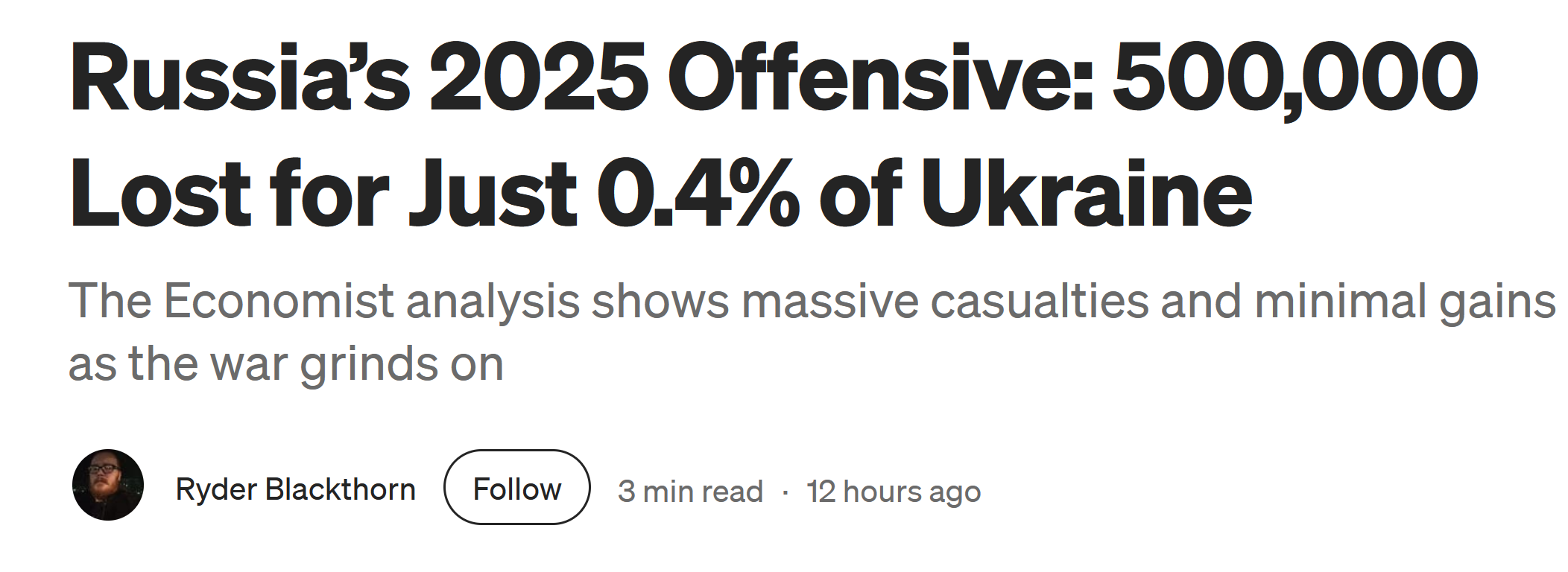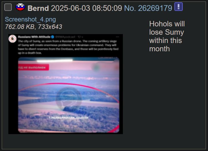 Previous: >>519243819Day 1,334 – Daily assessment: https://understandingwar.org/analysis/russia-ukraine/#research▶Latest>Russia’s 2025 Offensive: 500,000 Lost for Just 0.4% of Ukraine - The Economist>Russia to borrow a further 4.25T>Ukrainian APKWS downed a Kinzhal cruise missile>Russians are dying to Ukrainians 14:1 - Trump>Russia to mobilise from reserve soldiers of 2 million>Trump says russia has taken 1.5million casualties.>Ukraine has liberated Alekseevka>Russia's current account in Q2 falls to just $5.4B the lowest level of the war>The Ukrainian defense forces pushed the enemy back further near Nowe Schachowe, Solotyj Kolodjas, Kutscherowo Jar, and Nowopawliwka, - DeepState>No arab countries attended russia's summit, despite nearly all being invited>Khoroshe, Novoselivka, and Sichneve have been liberated>Mali Scherbaky & Sherbaky proper has been liberated>Pokvorsk is no longer our focus, the main focus now is to capture Prymorske - gerasimov, supreme commander of the russian army>Feodosia oil terminal is still burning for 5 days now>Some residents of New Moscow were left without electricity and water due to an "accident">The rise in gasoline prices in Russia set a 14-year record>Putin has started another mobilization, Russians are receiving notices on their electronic devices, barring them from leaving the country>40 000 Belgorod residents without electricity>Total Refinery Death continues including targets 2,000km away across the Ural mountains>Vorone has been liberated▶Telegramhttps://rentry.org/telosint2023https://t.me/ukr_pics▶Intelhttps://t.me/DeepStateENhttps://odin.tradoc.army.mil/WEG (equipment explorer)https://ukr.warspotting.net (visually confirmed losses)▶Mapshttps://deepstatemap.live/enhttps://liveuamap.com/en▶DISPOSABLE SOLDIER (diary of a RU mobik)TOUR 1: files.catbox.moe/34fuhc.txtTOUR 2: files.catbox.moe/uj2wut.txtTOUR 3: files.catbox.moe/hmyd98.txtTOUR 4: files.catbox.moe/cdenxe.txt