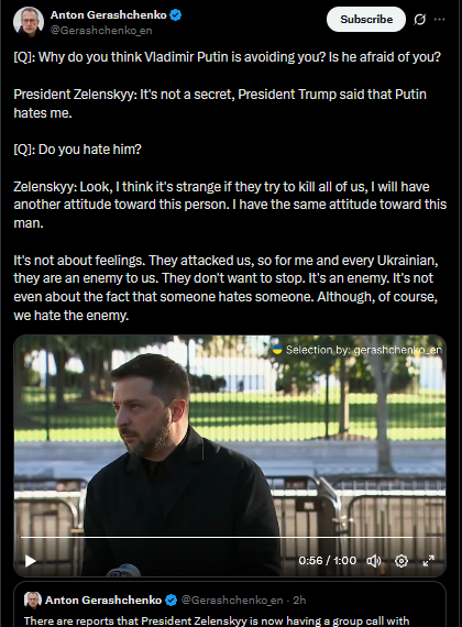[Q]: Why do you think Vladimir Putin is avoiding you? Is he afraid of you?President Zelenskyy: It's not a secret, President Trump said that Putin hates me.[Q]: Do you hate him?Zelenskyy: Look, I think it's strange if they try to kill all of us, I will have another attitude toward this person. I have the same attitude toward this man.It's not about feelings. They attacked us, so for me and every Ukrainian, they are an enemy to us. They don't want to stop. It's an enemy. It's not even about the fact that someone hates someone. Although, of course, we hate the enemy.https://x.com/Gerashchenko_en/status/1979291629233045733https://litter.catbox.moe/1l4aoge99la9t1fa.mp4