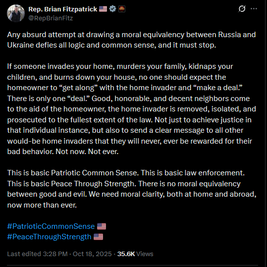 Thank you, Congressman, for your steadfast support of Ukraine.You make excellent points.https://x.com/Gerashchenko_en/status/1979599520800403934Any absurd attempt at drawing a moral equivalency between Russia and Ukraine defies all logic and common sense, and it must stop.If someone invades your home, murders your family, kidnaps your children, and burns down your house, no one should expect the homeowner to “get along” with the home invader and “make a deal.” There is only one “deal.” Good, honorable, and decent neighbors come to the aid of the homeowner, the home invader is removed, isolated, and prosecuted to the fullest extent of the law. Not just to achieve justice in that individual instance, but also to send a clear message to all other would-be home invaders that they will never, ever be rewarded for their bad behavior. Not now. Not ever. This is basic Patriotic Common Sense. This is basic law enforcement. This is basic Peace Through Strength. There is no moral equivalency between good and evil. We need moral clarity, both at home and abroad, now more than ever. #PatrioticCommonSense #PeaceThroughStrength https://x.com/RepBrianFitz/status/1979555091230400798>>519263859>Russia on the southern outskirtsfor a year, and they are still there