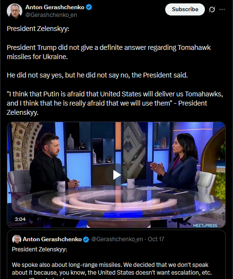 >>519263740President Zelenskyy:President Trump did not give a definite answer regarding Tomahawk missiles for Ukraine.He did not say yes, but he did not say no, the President said."I think that Putin is afraid that United States will deliver us Tomahawks, and I think that he is really afraid that we will use them" - President Zelenskyy.https://x.com/Gerashchenko_en/status/1979613298828943480https://litter.catbox.moe/vb5hlogfpui4i60k.mp4
