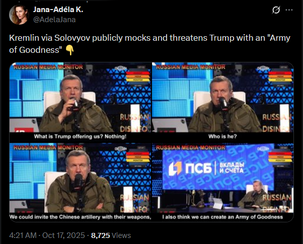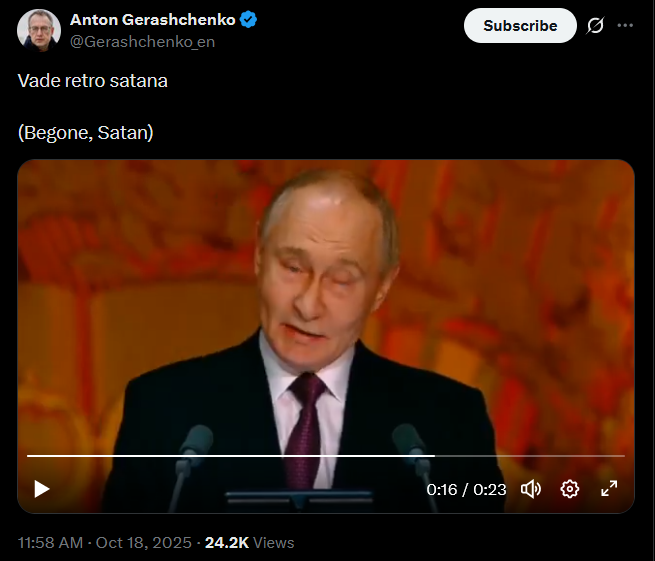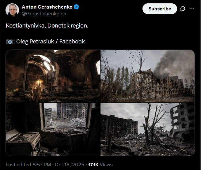 https://x.com/Gerashchenko_en/status/1979482702794350691Washington-Budapest: Is the end of the war possible?I’d like to share with you the thoughts of Ukrainian expert Vadym Denysenko.Trump’s statement following his meeting with Zelenskyy shows that his goal is to stop the war along the current front line. The main question now is what Putin’s response will be.1. Russian media have completely ignored Trump’s statement about the front line. Such unanimity is only possible with a direct order from the Kremlin. In these situations, the Kremlin typically uses one of three tactics:▪It provides its own interpretation;▪It allows the media to drown out an inconvenient story in a flood of speculation and guesses, then later selects three or four narratives that gained the most traction, so everyone fills in the blanks themselves;▪Or it simply switches to “silence mode.” As of now (12 hours after Trump’s statement), we’re seeing exactly that - silence mode.2. It’s still difficult to say what this silence means. It could indicate preparation to agree to this formula, or preparation to reject it publicly during the Budapest meeting.3. Trump’s conversation with Zelenskyy seems to have been a kind of ultimatum, with the following points:▪Trump aims to achieve a ceasefire along the front line;▪He is willing to concede to some of Putin’s demands - such as allowing Russian-backed parties to participate in Ukrainian elections, restoring the Russian Orthodox Church’s operations, granting Russian language rights, withdrawing certain lawsuits, and partially lifting sanctions. It’s still unclear what demands Russia might make regarding the reduction of Ukraine’s missile program, as well as its military and defense industry. If an agreement is reached, presidential elections (possibly combined with parliamentary elections) could be held within 45 days.>part 1