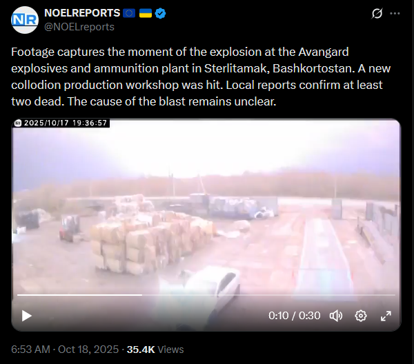 Footage captures the moment of the explosion at the Avangard explosives and ammunition plant in Sterlitamak, Bashkortostan. A new collodion production workshop was hit. Local reports confirm at least two dead. The cause of the blast remains unclear.https://x.com/NOELreports/status/1979425553888251937https://litter.catbox.moe/ybacs5ajudyporqu.mp4