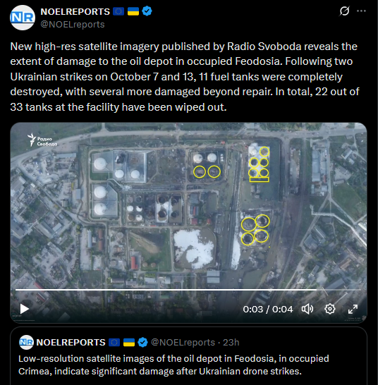 New high-res satellite imagery published by Radio Svoboda reveals the extent of damage to the oil depot in occupied Feodosia. Following two Ukrainian strikes on October 7 and 13, 11 fuel tanks were completely destroyed, with several more damaged beyond repair. In total, 22 out of 33 tanks at the facility have been wiped out.https://x.com/NOELreports/status/1979514259940823357https://litter.catbox.moe/rkjngo3iukme9iyy.mp4