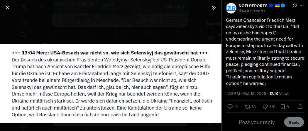 German Chancellor Friedrich Merz says Zelensky’s visit to the U.S. “did not go as he had hoped,” underscoring the urgent need for Europe to step up. In a Friday call with Zelensky, Merz stressed that Ukraine must remain militarily strong to secure peace, pledging continued financial, political, and military support. “Ukrainian capitulation is not an option,” he warned.https://x.com/NOELreports/status/1979527489245368479