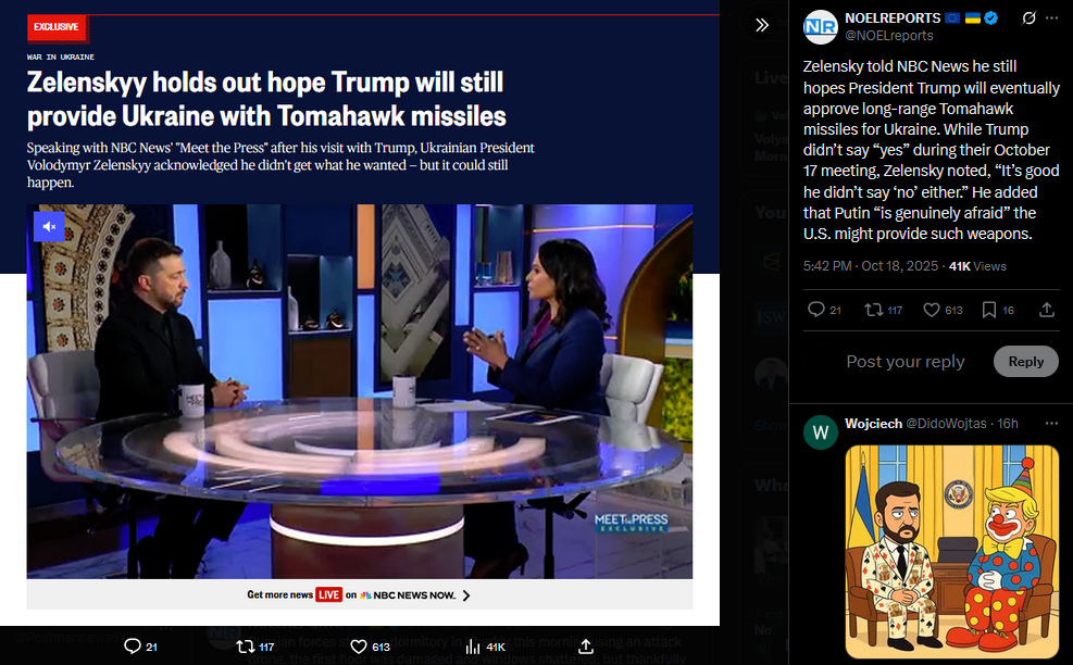 Zelensky told NBC News he still hopes President Trump will eventually approve long-range Tomahawk missiles for Ukraine. While Trump didn’t say “yes” during their October 17 meeting, Zelensky noted, “It’s good he didn’t say ‘no’ either.” He added that Putin “is genuinely afraid” the U.S. might provide such weapons.https://x.com/NOELreports/status/1979588905159872968