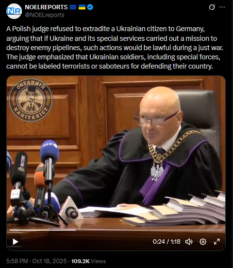 A Polish judge refused to extradite a Ukrainian citizen to Germany, arguing that if Ukraine and its special services carried out a mission to destroy enemy pipelines, such actions would be lawful during a just war. The judge emphasized that Ukrainian soldiers, including special forces, cannot be labeled terrorists or saboteurs for defending their country.https://x.com/NOELreports/status/1979592863382991298