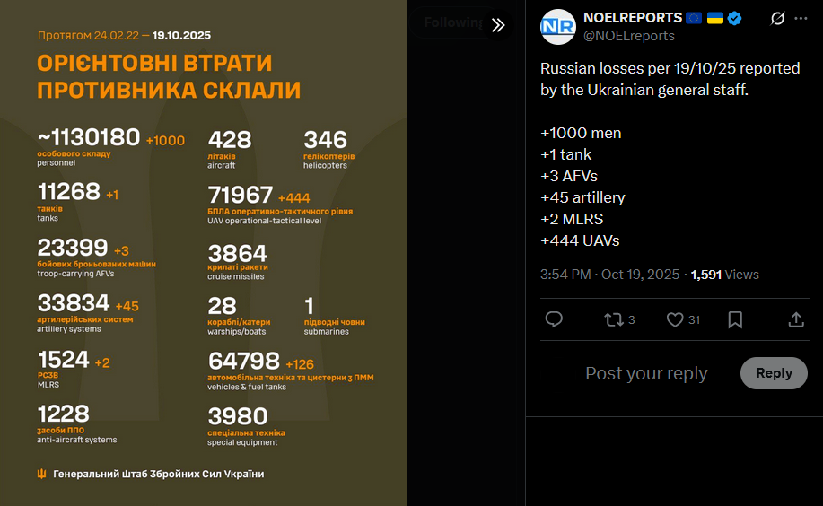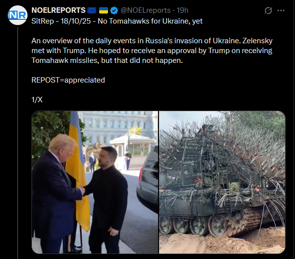 SitRep - 18/10/25 - No Tomahawks for Ukraine, yetAn overview of the daily events in Russia's invasion of Ukraine. Zelensky met with Trump. He hoped to receive an approval by Trump on receiving Tomahawk missiles, but that did not happen.https://x.com/NOELreports/status/1979639217711120543