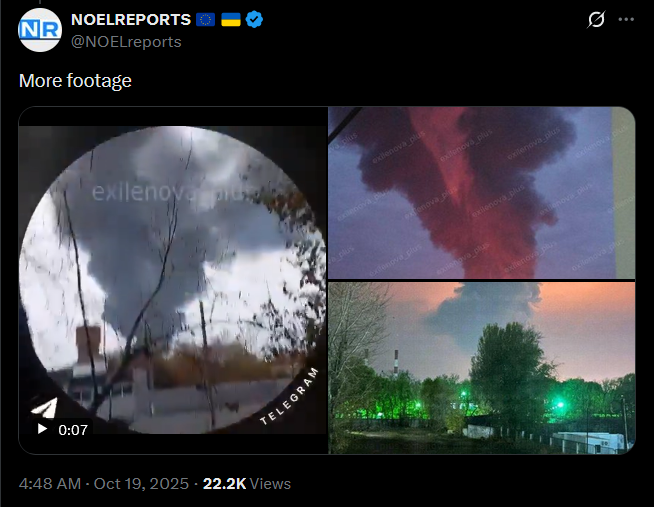 Ukraine successfully struck the 500 kV Veshkama substation, an essential node linking the Urals and central Russia's power grids. Explosions were also reported overnight in the Moscow region. Airports in Nizhny Novgorod, Penza, Samara, Tambov, Sochi, Kaluga, Ulyanovsk, and Ufa temporarily halted air traffic.https://x.com/NOELreports/status/1979428731132244232