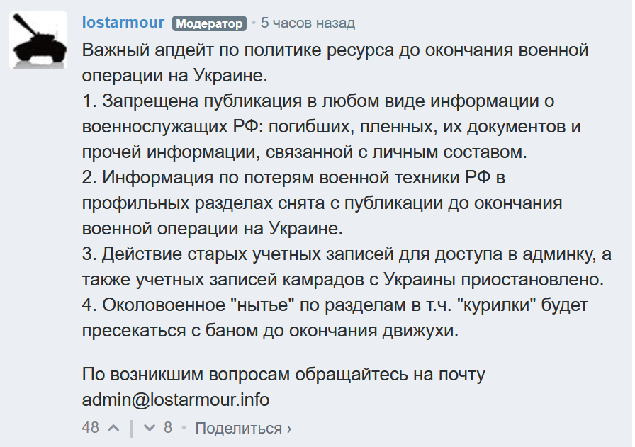 >>519288804lostarmour (Moderator) • 5 hours agoImportant update regarding the site’s policy until the end of the military operation in Ukraine.It is prohibited to publish in any form information about Russian Armed Forces personnel: killed, captured, their documents, or any other information related to individuals.Information about losses of Russian military equipment in the relevant sections has been removed from publication until the end of the military operation in Ukraine.The access of old admin accounts, as well as accounts of comrades from Ukraine, has been suspended.Complaining or “whining” related to the war, including in the “chatter” sections, will be met with bans until the end of the operation.For any questions, contact admin@lostarmour.info