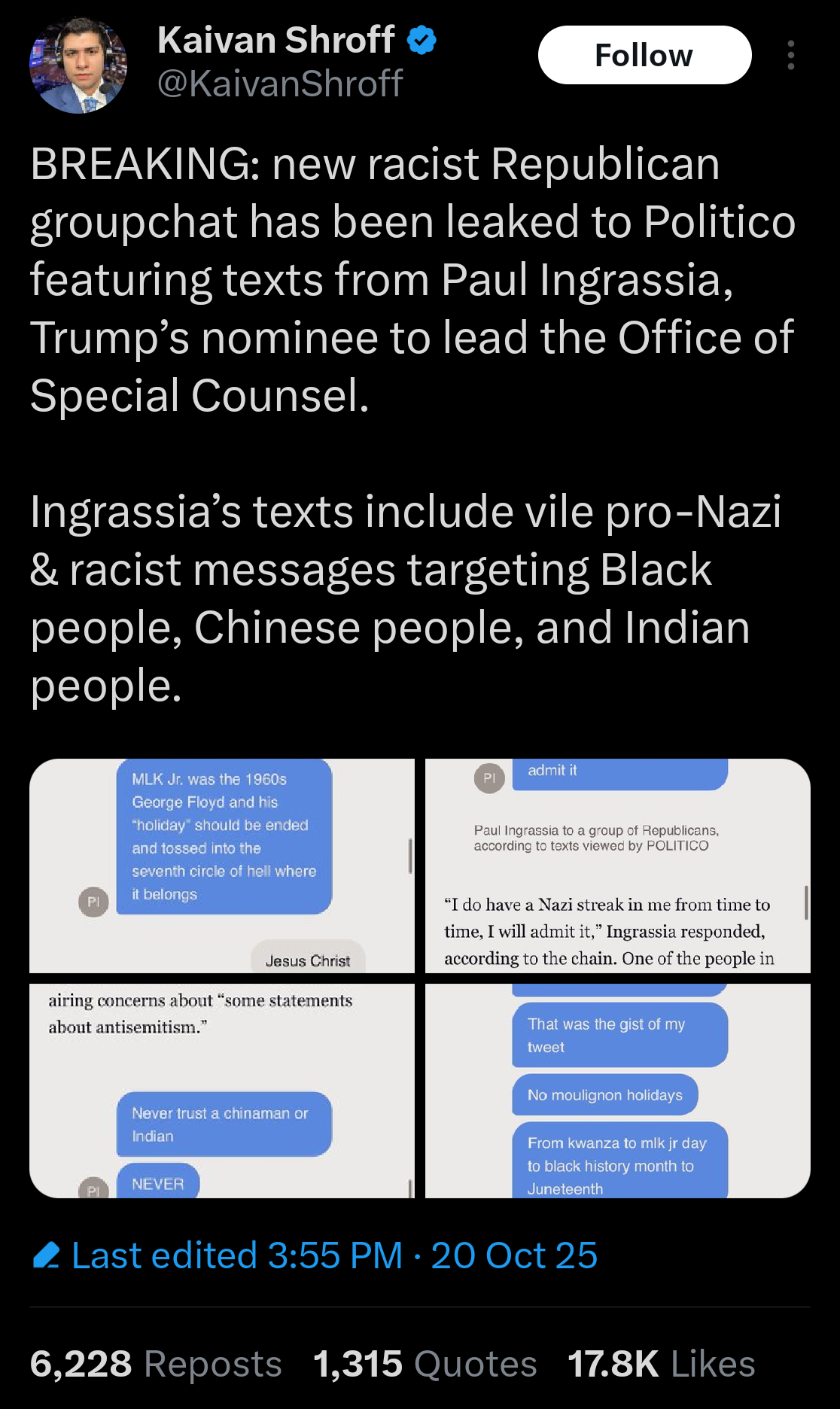 Yet another leak of Republican counsel members being racist fascists. Once again proving Democrat right that the Republican party is full of bigots. https://x.com/KaivanShroff/status/1980362223332782446