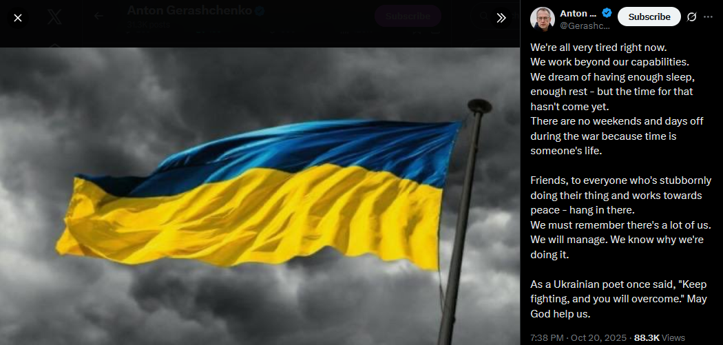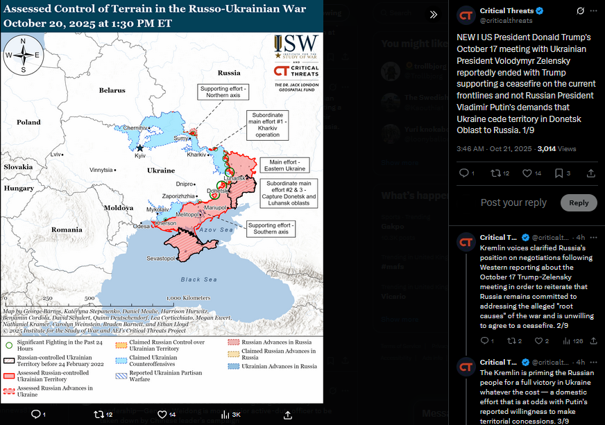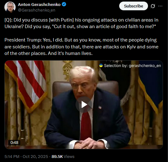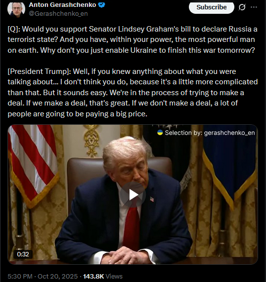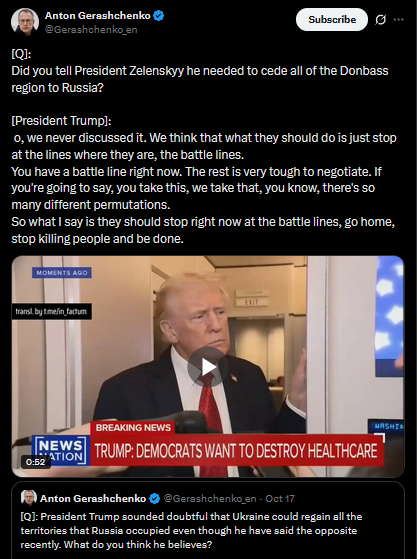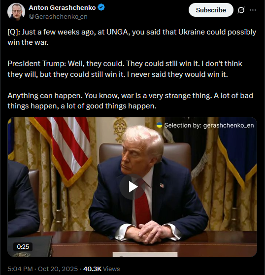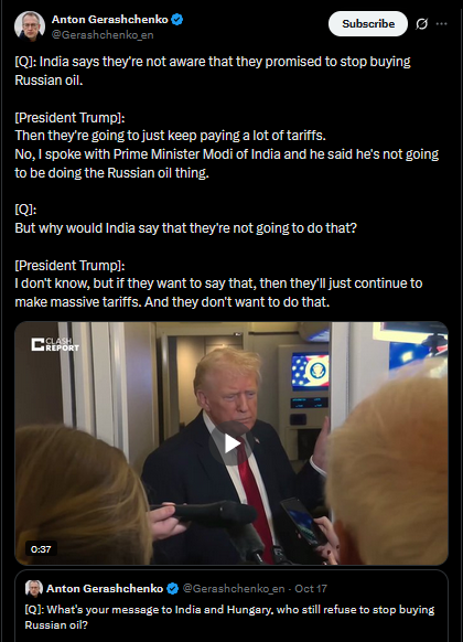 [Q]: India says they're not aware that they promised to stop buying Russian oil.[President Trump]: Then they're going to just keep paying a lot of tariffs.No, I spoke with Prime Minister Modi of India and he said he's not going to be doing the Russian oil thing. [Q]: But why would India say that they're not going to do that? [President Trump]:I don't know, but if they want to say that, then they'll just continue to make massive tariffs. And they don't want to do that.https://x.com/Gerashchenko_en/status/1980158331613597993>yesterdayhttps://files.catbox.moe/42tqk8.mp4
