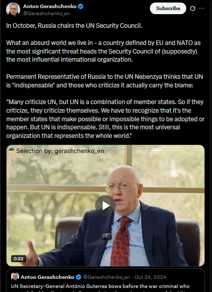 In October, Russia chairs the UN Security Council.What an absurd world we live in - a country defined by EU and NATO as the most significant threat heads the Security Council of (supposedly) the most influential international organization.Permanent Representative of Russia to the UN Nebenzya thinks that UN is "indispensable" and those who criticize it actually carry the blame:"Many criticize UN, but UN is a combination of member states. So if they criticize, they criticize themselves. We have to recognize that it's the member states that make possible or impossible things to be adopted or happen. But UN is indispensable. Still, this is the most universal organization that represents the whole world."https://x.com/Gerashchenko_en/status/1980199926429610374https://files.catbox.moe/31hn8w.mp4