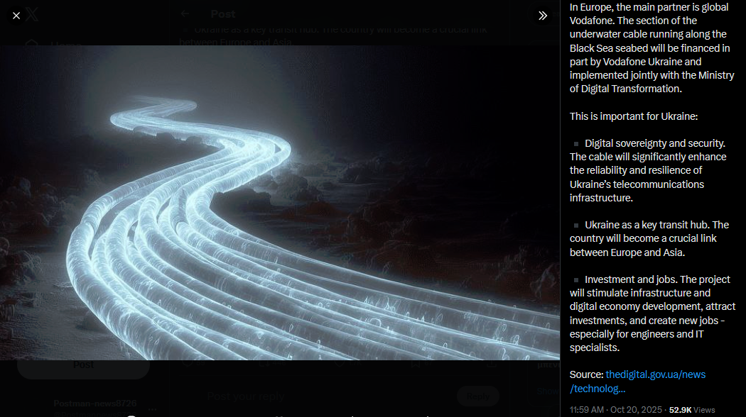 An underwater cable will be laid across the Black Sea to connect Europe and Asia - bypassing Russia.The Kardesa cable system will link Ukraine, Bulgaria, Turkey, and Georgia, becoming part of a digital corridor connecting Europe and Asia. Construction of the first section in Bulgaria is set to begin in 2027, with the project valued at over €100 million.In Europe, the main partner is global Vodafone. The section of the underwater cable running along the Black Sea seabed will be financed in part by Vodafone Ukraine and implemented jointly with the Ministry of Digital Transformation.This is important for Ukraine:▪ Digital sovereignty and security. The cable will significantly enhance the reliability and resilience of Ukraine’s telecommunications infrastructure.▪ Ukraine as a key transit hub. The country will become a crucial link between Europe and Asia.▪ Investment and jobs. The project will stimulate infrastructure and digital economy development, attract investments, and create new jobs - especially for engineers and IT specialists.Source: https://thedigital.gov.ua/news/technologies/bezpechnyy-internet-dlia-ukrayiny-vodafone-proklade-mahistralnyy-kabel-cherez-chorne-moreGlowing white tubular cables snake across a dark seabed forming multiple parallel paths with subtle blue hues suggesting underwater environment and digital connectivity theme.https://x.com/Gerashchenko_en/status/1980227298172264662